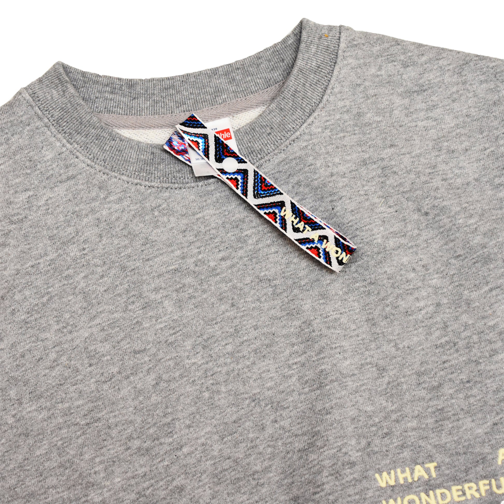 鮮やかなエスニックの柄に、ボディと同じリサイクル糸でブランドのタグラインである"WHAT A WONDERFUL EARTH"を刺繍した特徴的なタグは、両端にスナップボタンを施すことで取り外しができる仕様に。そのまま首元に付けて着ても、外して手首に付けても、着る人が自由に楽しめるようにギミックが効いたつくりにしました。インスピレーション源は、2017年に訪れた英国のアート&ミュージック フェスティバル<HOUGHTON Festival>のリストバンドから。かれこれ20年以上、数えきれないほどのキャンプinフェスを訪れましたが、これほどデザイン性の高い、イカしたリストバンドを見たことがなく、感動したことがきっかけです。